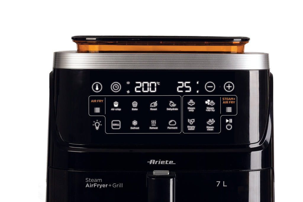 Air Fryer with Steam Function + Grill with 10 pre-set programs for air frying, grilling, using the standard functions of the oven, dehydrating, roasting, backing from pizzas to cakes, heating, fermenting, and steam cooking. You can prepare large amounts thanks to the 7-litre capacity at a temperature adjustable up to 200 °C.