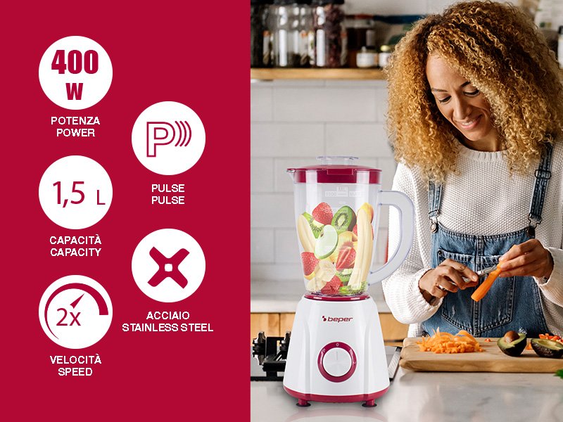 Beper Blender 1.5L Plastic, 4 Stainless Steel Blades, 2 Speeds, And Pulse Function, P102FRU501