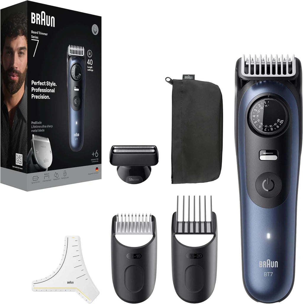 The Braun Series 7 beard trimmer is designed for professional precision and perfection with every stroke. With the ultra-sharp ProBlade blade and AutoSense technology, this trimmer catches even the toughest hairs. Forget mistakes with the PrecisionLock button and stay in control for flawless style with 40 length settings. Whether you are trimming, shaving, defining your contours, or finishing the details, this trimmer offers the best tools for flawless lines, gradients and finishes.What's in the box: 1 beard trimmer, 2 combs, 1 accessory, 1 beard stencil, 1 refill base, 1 pouch, 1 cleaning brush.