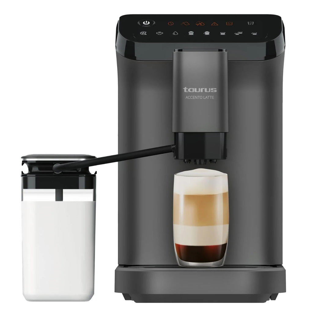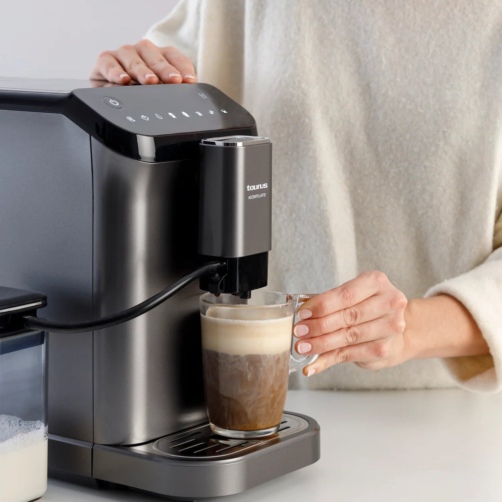 The Accento Latte super-automatic coffee machine by Taurus combines Thermoblock technology, a 20-bar pump, and the QuickCoffee system for perfect coffee in under 1 minute. It features a milk container for cappuccinos, an adjustable grinder, and a touch system with 4 pre-programmed drinks. Its AlwaysClean system and removable parts make maintenance easy. With a 1.5L water tank and adjustable outlet, it’s perfect for customizing every cup. Enjoy freshly ground and creamy coffee quickly and effortlessly.