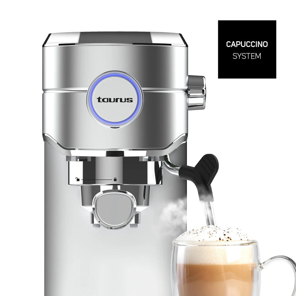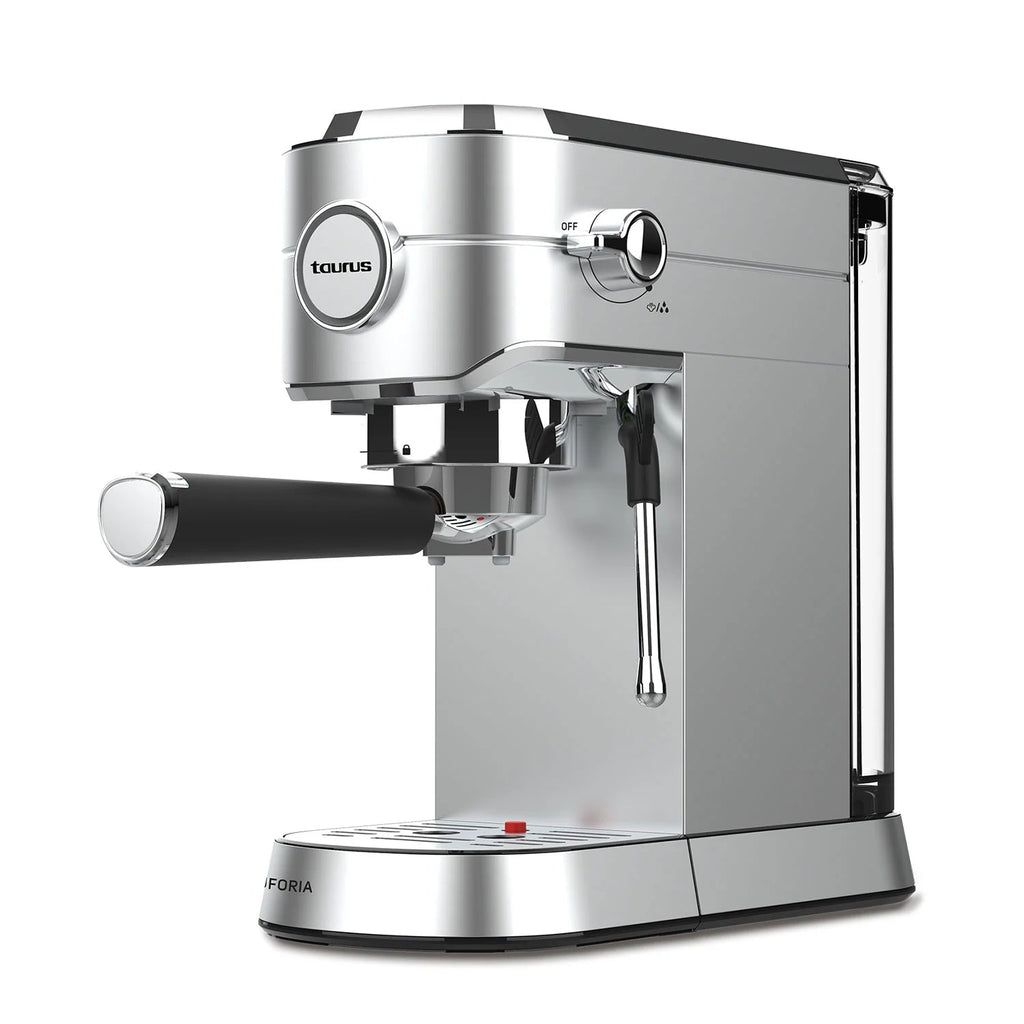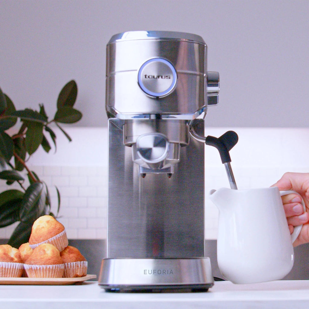 The Euforia espresso machine by Taurus combines 20-bar pressure, 1450W power, and a Thermoblock system for fast heating and professional-quality espresso. With the Supreme Cream System, it ensures a dense and consistent crema. It features a steam wand, stainless steel cup warmer, 1L removable water tank, and is compatible with ESE pods. Its stainless steel finish adds durability and style to any kitchen.