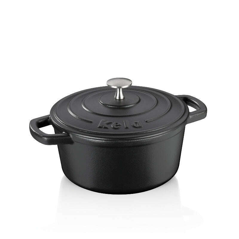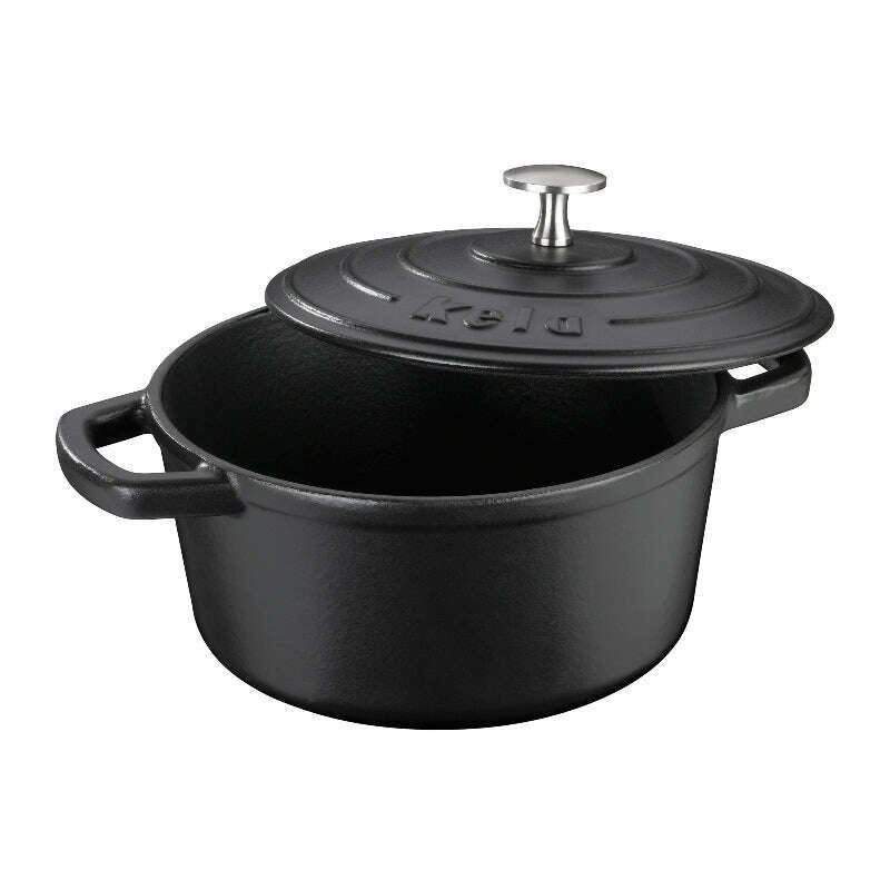 Cast iron roaster Calido round, Ø 21 cm, 2,5 L, shiny, in black with lid. Can be used up to 300° C. Base diameter 16 cm.