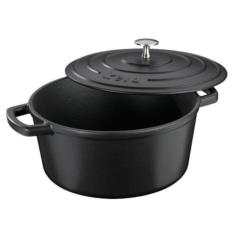 Cast iron roaster Calido round, Ø 26 cm, 5,0l, shiny, in black with lid. Can be used up to 300° C. Base diameter 20 cm.
