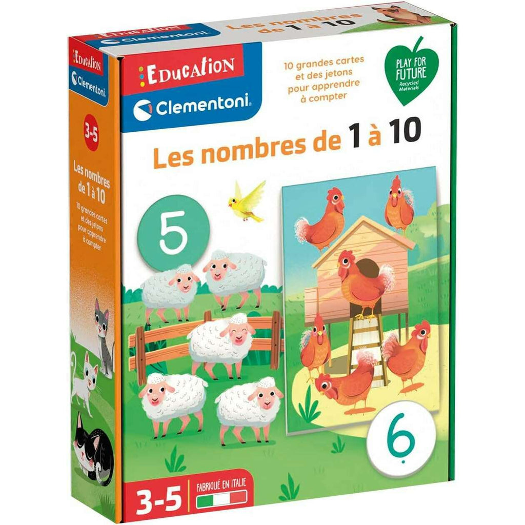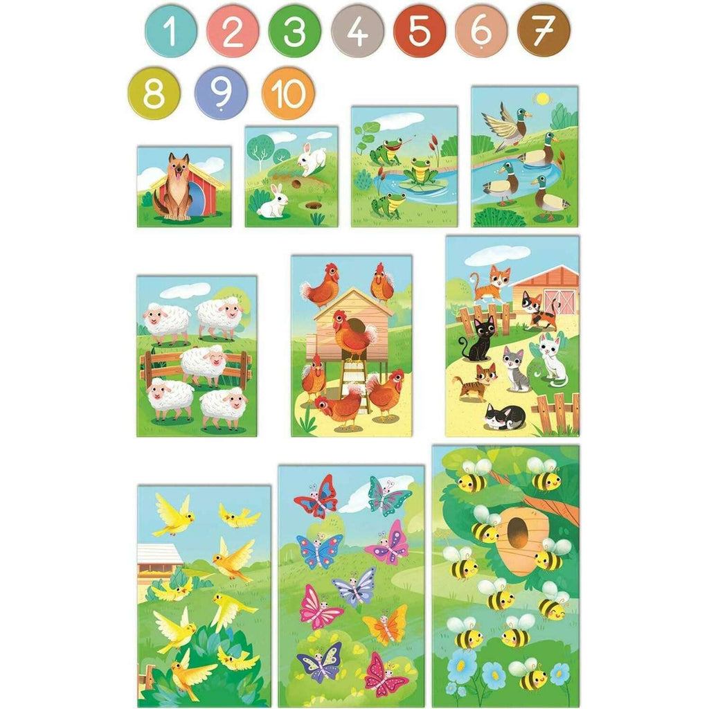 The box contains 10 tokens with numbers and 10 double-sided cards: one side shows 1 to 10 animals in their habitat, the other side shows the number and the corresponding quantity.