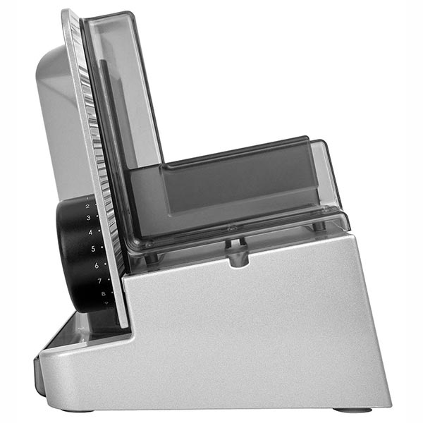 Slice thickness continuously adjustable: Stepless adjustment of the slice thickness is possible from wafer-thin up to approx. 20 mm. Thanks to the infinitely variable slicing thickness adjustment, the food can be cut into appetising slices.