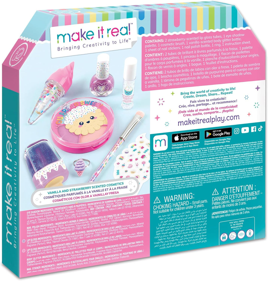 • SWEET STYLE: This set is complete with the sweetest candy-shaped cosmetics: ice cream-shaped lip glosses, a sprinkle filled cosmetics brush, donut-shaped eye shadow pallet, and more!