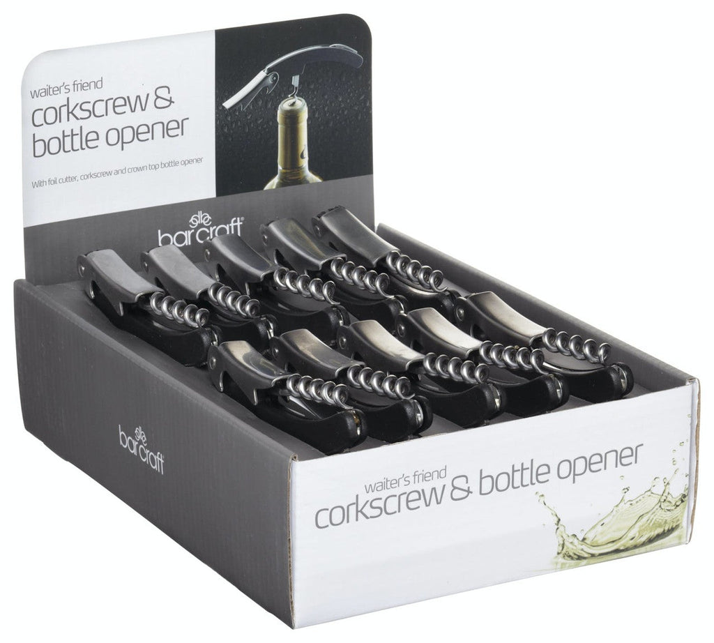 This classic style waiter's friend corkscrew, so called by its traditional restaurant use is completely compact. The all in one corkscrew also features a crown top bottle opener and foil cutter knife, that folds inside for convenient storage. Counter top display includes twenty style waiter's friend corkscrews. Everyday essentials for the bar at home, BarCraft offers a selection of bar essentials to bring the fun inside your home. Covering wine, cocktails, spirits and so much more, BarCraft is the perfect choice when wanting to relax at home, feeling refreshed and revitalised.