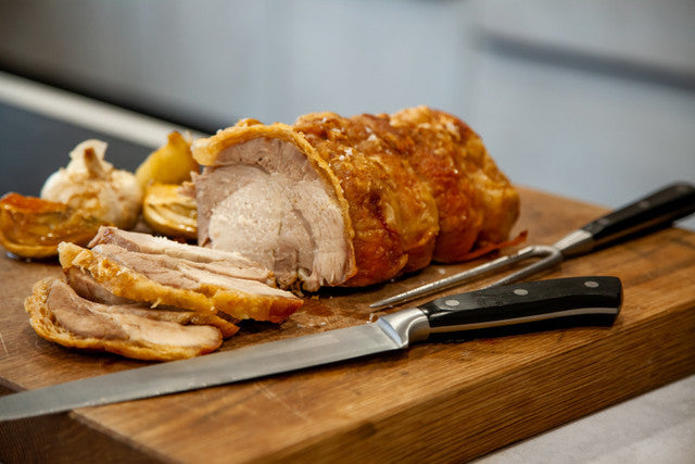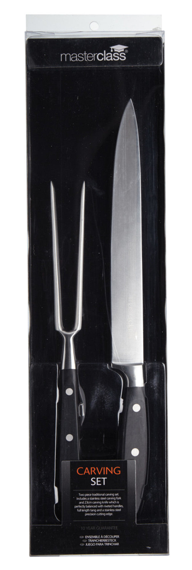Shoulder of beef, whole chicken or turkey crown – whatever you're serving, you can carve it with controlled precision with this Stainless Steel Meat Carving Set from MasterClass. This two-piece set includes a 23 cm (9”) carving knife and a 13.5 cm (5½”) carving fork. With its combination of heavy-duty stainless steel blades, full-length tangs and riveted handles, it’s built to peform impressively roast after roast! Carve Meat Safely and Easily The carving fork's twin-pronged design makes it really simple to hold your meat or poultry steadily in place, as you carve with the knife's sharp blade. The knife features a precision ground cutting edge. This makes it easy to achieve a precise cut every time. The handle is moulded to follow the shape of the blade exactly, so it won’t trap food when cutting. And because both the knife and fork are constructed from heavy-duty stainless steel, you don't have to worry about them becoming tainted or stained. Perfectly Balanced for Controlled Cutting Holding the knife and fork steady as you serve is easy. They both feature full-length tangs and ergonomic handles, so you can maintain complete control. They're also riveted for strength, so you can carve your next roast with complete confidence! Useful Information — Includes a 23 cm (9") blade, carving knife and a 13.5 cm (5½") carving fork — Dishwasher safe – for maximum performance and longevity, hand washing is recommended for the first 12 months — Protected by MasterClass's 10 year guarantee