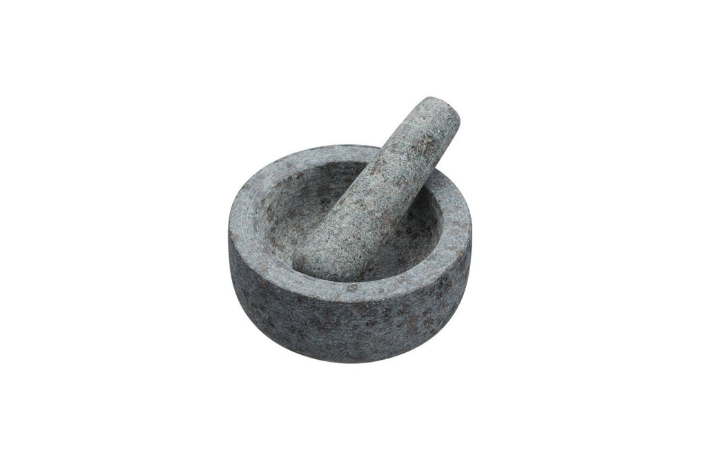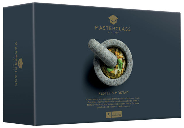 Bring the fantastic flavours and appetising aromas of crushed herbs and spices to your recipes with the MasterClass Granite Pestle and Mortar. This set is designed to be elegant and stylish, while making it easy and comfortable to grind ingredients. The grey granite looks great in any setting, while being robust enough for busy kitchens. And it follows the traditional pestle and mortar design that’s a favourite of professional chefs. It’s ideal for preparing curry pastes, pestos and dips, or simply for extracting maximum flavour from ingredients to bring out the best in your cooking. Textured Bowl and Comfort Pestle This pestle and mortar set is so easy to use. The mortar bowl has a textured interior, which makes it much easier to crush spices to bring out their delicious oils and flavours. Slightly wider than most mortar bowls, it's size means there's less chance of spills. It also includes a comfort-shaped pestle, which is designed to reduce the strain on your hands as you crush, mash and grind ingredients. Super-Strong Granite Design There’s a reason granite tools are commonly used by professional chefs – they’re incredibly strong and robust. This granite pestle and mortar won’t crack, and it’s non-porous so won’t absorb any of the oils you extract from your herbs and spices. This makes it quick and easy to clean too. A Beautiful Gift With its elegant, rustic style, this mortar and pestle set looks lovely displayed in your kitchen. It’s packaged in a beautiful gift box too, so it makes the perfect gift for any food lover! Useful Information — Includes a 4 x 12.5 cm (2" x 5") granite pestle and a 12 x 9 cm (4½" x 3½") bowl — Hand-wash only — Gift boxed — With MasterClass's 12 month guarantee