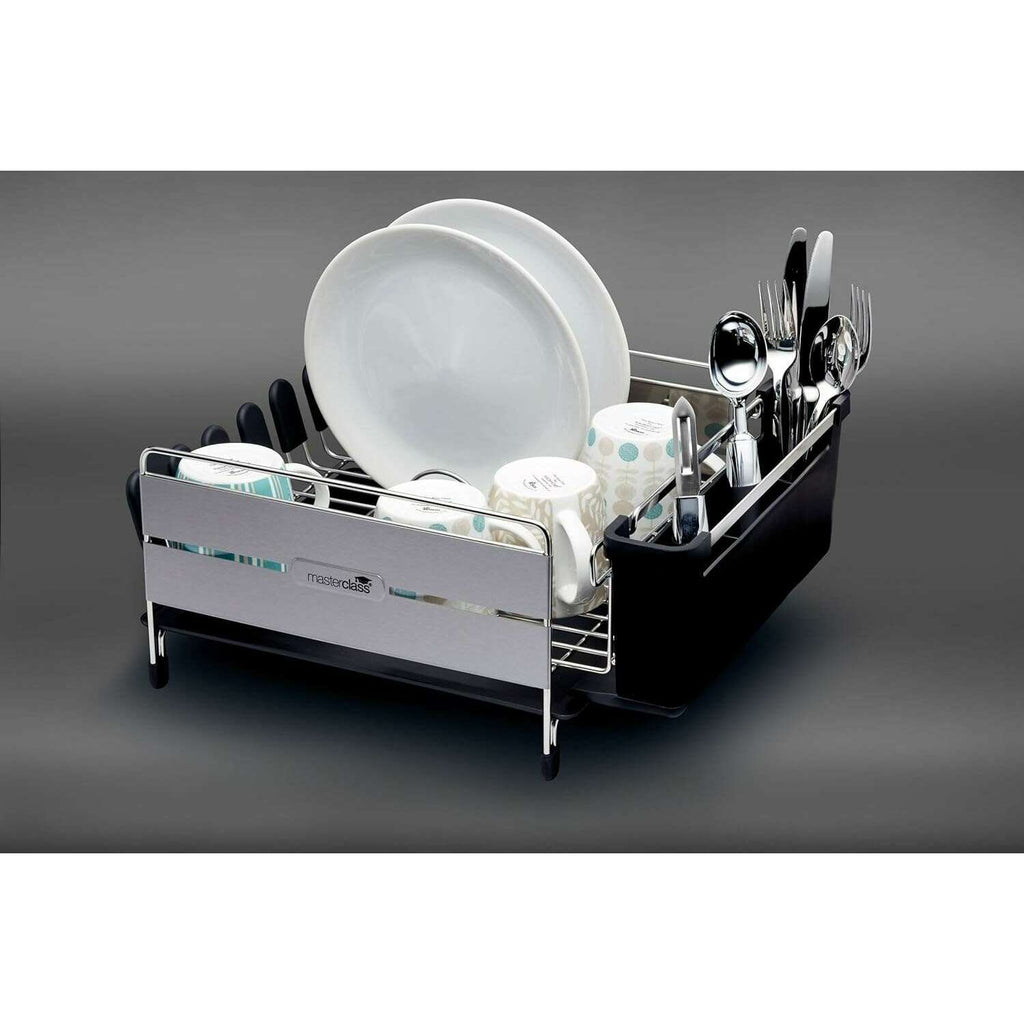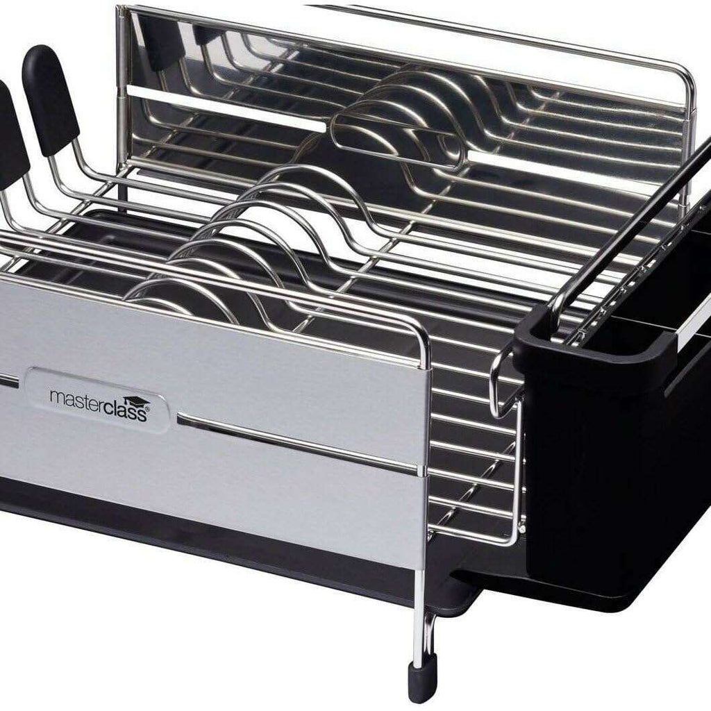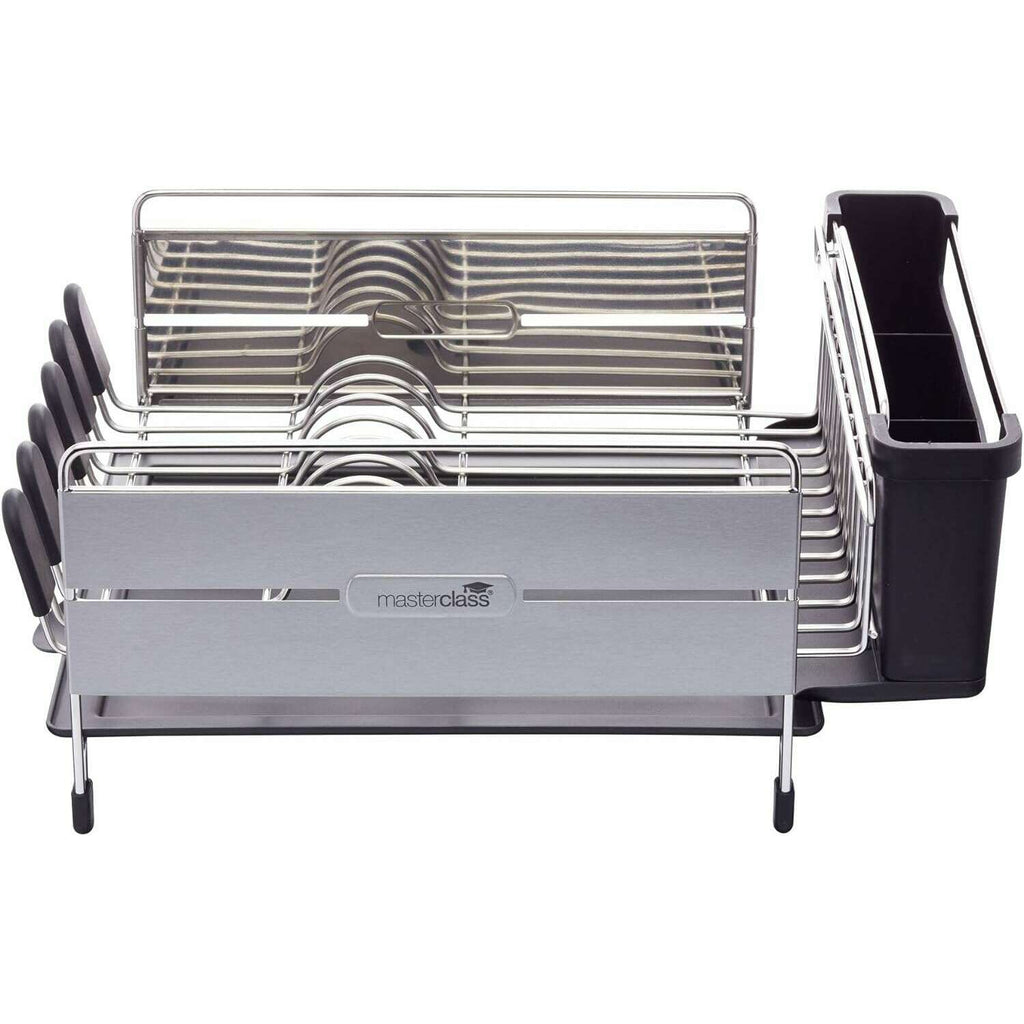 This large dish rack is Master Class’s deluxe take on a kitchen classic. Its generous proportions mean there’s plenty of space for plates, cups and cutlery, and it’s packed with clever features to take the hassle out of washing up. At 44.5 x 32 cm (17½” x 12½”), this dish rack is great for big washing up jobs (like a post-dinner-party clean-up!). It makes efficient use of this space, with room for plenty of dinner plates, plus extra storage for cutlery, cups, mugs and more. And with its durable, stylish construction and raised rubber feet, it’s specially designed to be long-lasting and resistant to rust. It’s a quick and hygienic way to dry your dishes, so you don’t have to waste time with a tea towel. Ingenious Drip Tray and Draining Spout Have you ever left plates and cutlery to dry on the draining board, and come back later to find a pool of unpleasant-smelling water? This washing up drainer has a clever solution – a removable plastic drip tray, complete with a multi-directional draining spout. This collects any water that drips off your dishes and directs it back into the bowl. It’s a hygienic way to deal with water build-up, and it prevents unpleasant smells and rusty draining boards too. With Cutlery Holder and Cup Rack The included cutlery holder provides a handy, safe place to store your knives, forks and spoons while they drain. And because it’s removable, it makes it really easy to put your cutlery away once it’s dry. The rack also includes an integrated mug holder, which holds up to three cups or glasses, even when the drainer is full. Durable and Stylish The Master Class Large Deluxe Stainless Steel Dish Drainer Rack will fit right in with any kitchen. Its shiny stainless steel look is stylish and versatile, as well as offering excellent durability, tarnish resistance and odour resistance. Useful Information — Measures 44.5 x 32 x 19.5 cm (17½" x 12½" x 7½") — Cutlery holder, drip tray and spout made of BPA-free, food-safe plastic — With non-slip, non-scratch rubber feet to prevent rust and scratches — Hand-wash only — Comes with a five year guarantee
