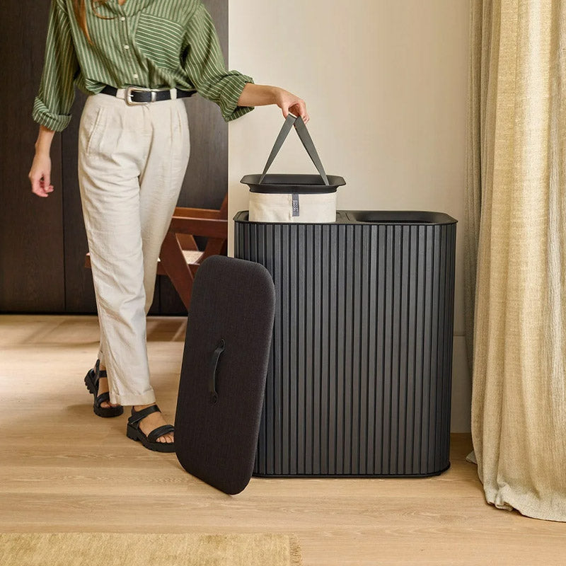 Elevate your laundry routine with this sleek black bamboo basket featuring two 45L fabric bags for easy sorting and carrying. Stylish and functional, it fits beautifully in any bedroom decor.