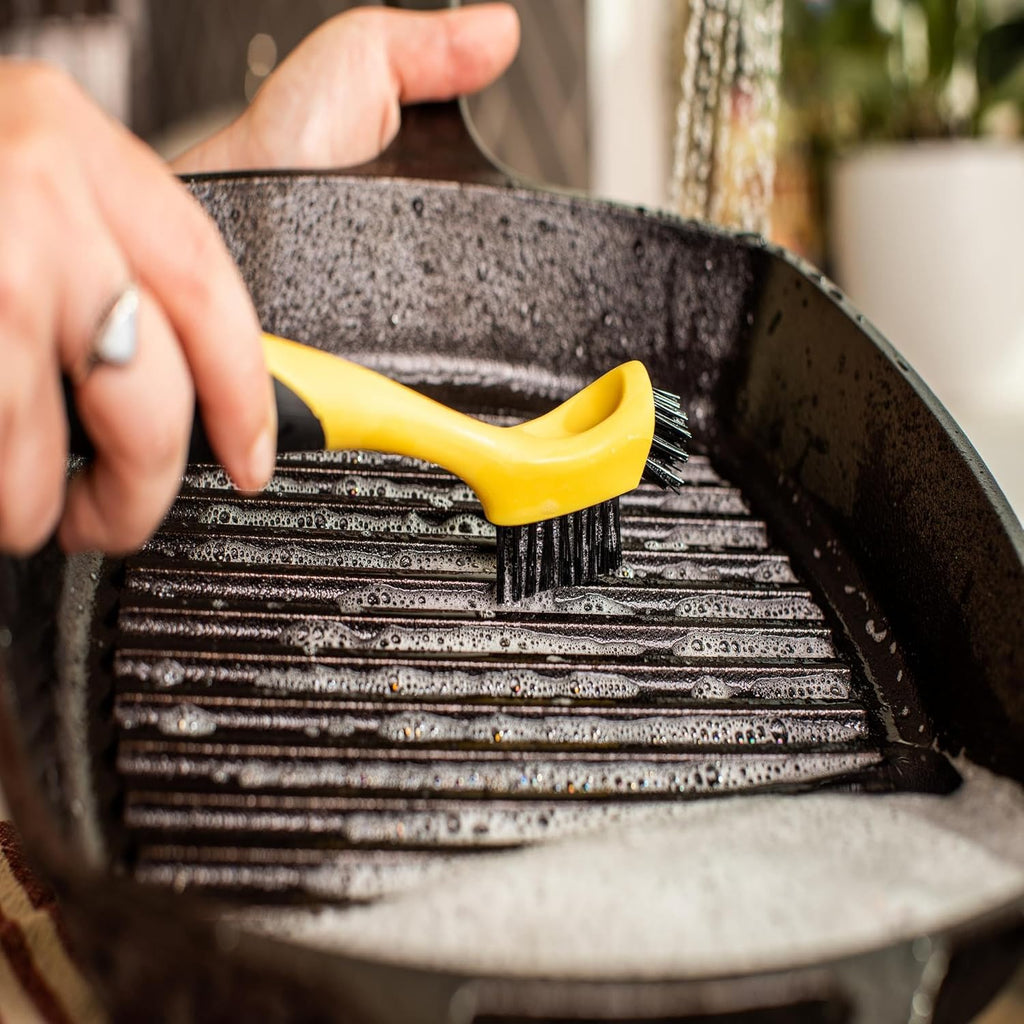 • Keep cast iron pans spotless with this ingenious bristle brush, designed to remove cooked-on food from corners, grooves, even between grill ribs