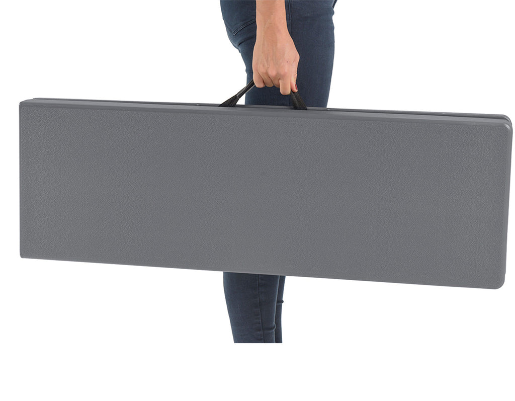 Bench measuring 183 cm with a mid-folding seat and a carrying handle, like a suitcase. The mid-folding top facilitates its handling and storage.