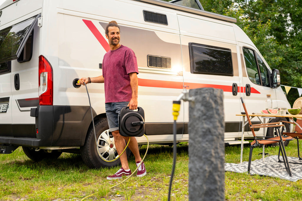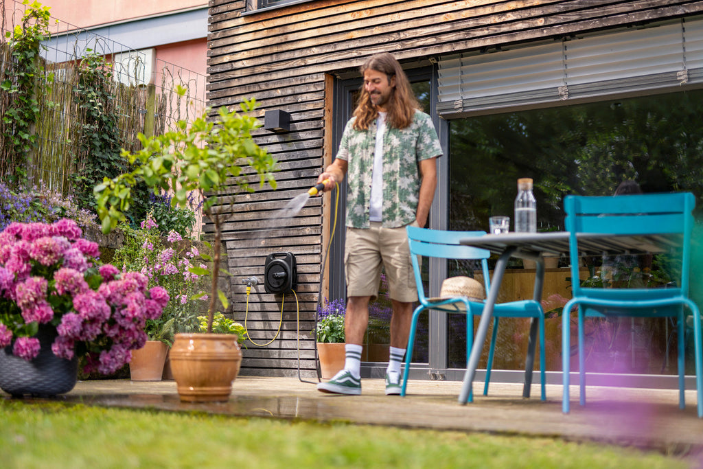 Compact hose box for balconies, roof terraces, small gardens and camping holidays. Fast, convenient unwinding and winding. Ideal for space-saving storage in apartments.