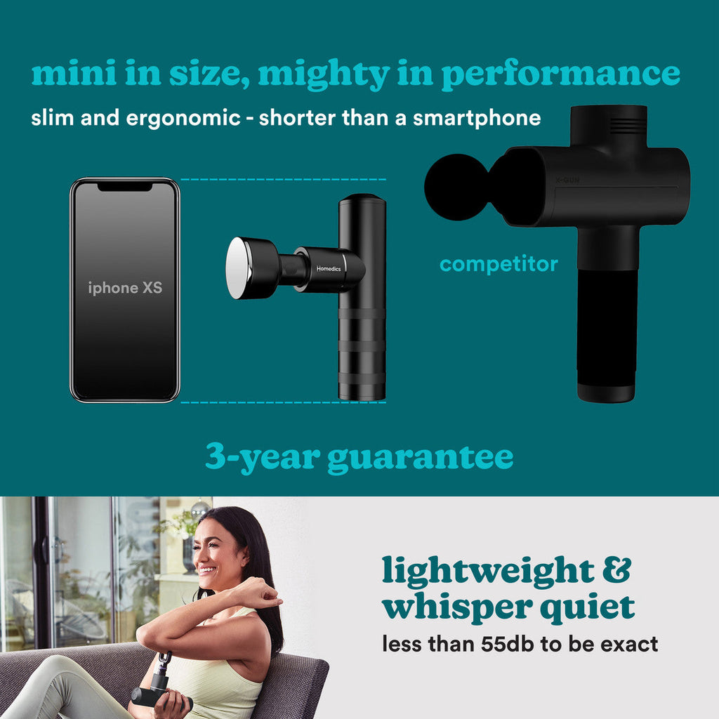 Small in size but mighty in performance, the Homedics MYTI Mini Massage Gun combines precision power with a luxe, lightweight design that is shorter than a smartphone for elite recovery on the go.