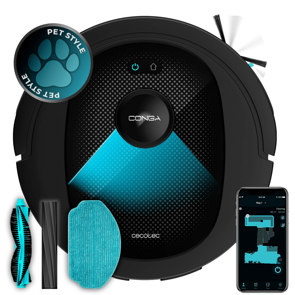 Conga 8490 Ultimate Ultra Power Home Robot vacuum cleaner with laser navigation technology. Self-emptying base 2.5 L capacity. 4-in-1 cleaning: sweep, vacuum, mop and mop. Suction power of 7000 Pa. Up to 170 minutes of autonomy. Includes 2 interchangeable central brushes: one mixed and one silicone, optimal for pet hair. Scrubbing mop and 1 side brush. 4 selectable levels of suction power and scrubbing water. APP control and virtual assistants.