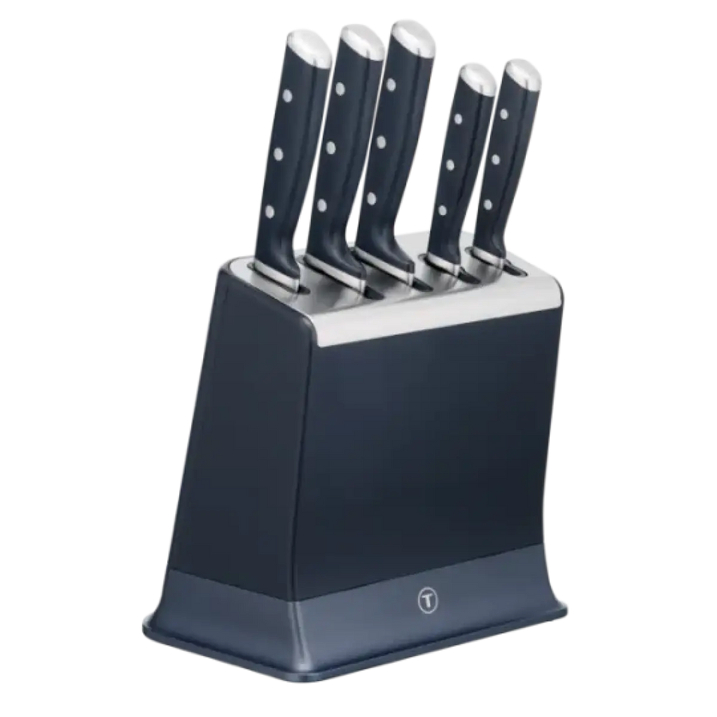 - The right knife for every cut: One block for all your cutting needs - chef knife, santoku knife, utility knife, paring knife & bread knife.