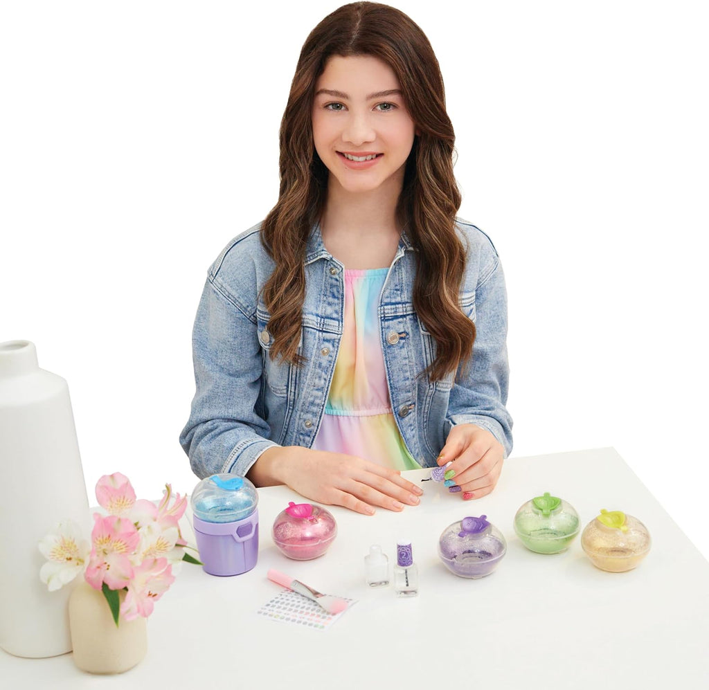 • EVERYTHING INCLUDED: Design set has everything tweens need to create 500 glittery party nails. Includes Sparkle Spinner, 5 glitter pods, bottle of Sparkle Primer, bottle of clear nail polish, brush & nail sticker sheet.