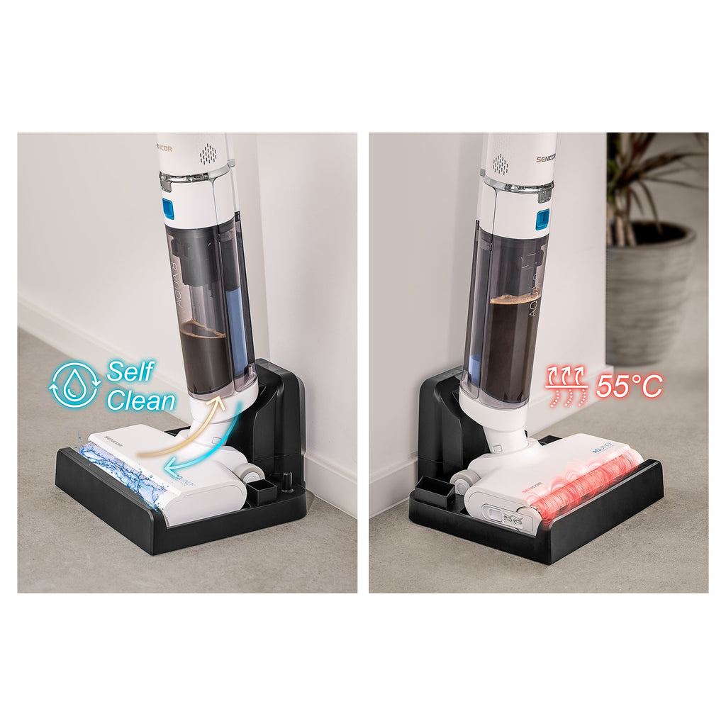 Struggling to keep your floors spotless and still not satisfied? Discover the game-changing Sencor SVW 5010WH AQUINO hard floor cleaner. Equipped with a powerful digital motor delivering up to 11,000 Pa of suction and featuring Wet & Dry technology, this cleaner effortlessly tackles both dry and wet messes. The Power Spin Aqua 8 achieves great results during mopping thanks to the high speed of the rotating brush. The specially designed brush also ensures you can clean right up against the wall. It has two separate tanks for clean and dirty water. The Self-Cleaning feature takes care of maintenance for you, with automatic hot-air drying when docked in the charging station. It lasts up to 25 minutes on a single charge. Fast charging support is also a great benefit. You will also appreciate the compact design and the low weight of 3.5 kg.