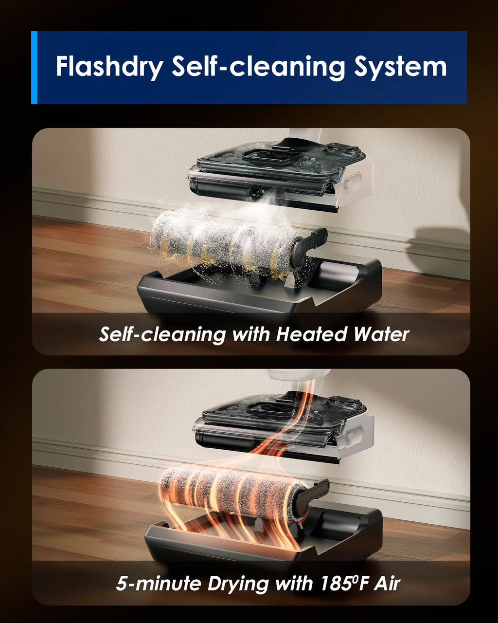 Using heated fresh water to effectively dissolve stains from the pipe to the brush roller, and then using 185°F hot air to effectively dry every part of the machine. Truly worry-free after use.