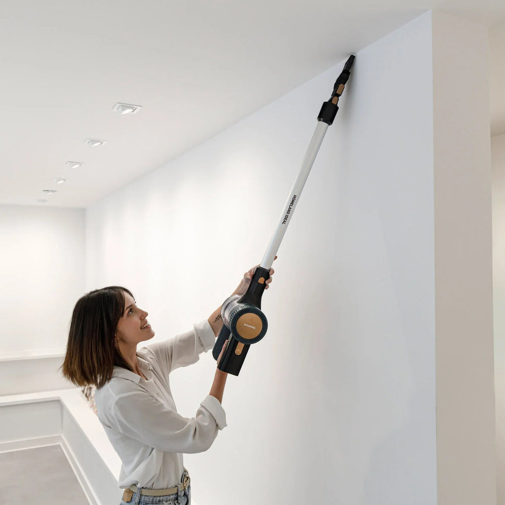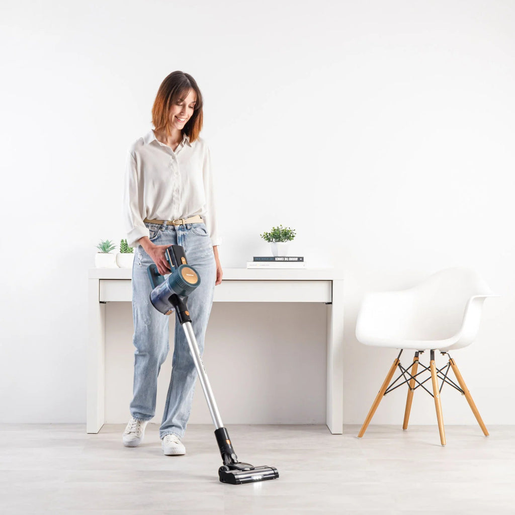 The Homeland Ideal cordless vacuum cleaner by Taurus combines 150W of power, 10,000 Pa suction, and a removable battery with 40 minutes of runtime. With Triple Advanced Filtration (HEPA, cyclonic, and mesh), a Turbo Brush nozzle, and ALL ROAD and FUZZY brushes, it is perfect for all surfaces. It features a hygienic 500 ml dust container, LED lighting, parking position, and versatile accessories. Its practical and lightweight design ensures efficient cleaning in every part of your home.