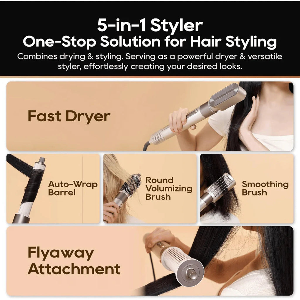• One-Stop Solution for Hair Styling: With two nozzles and three attachments - Fast Dryer, Auto-Wrap Barrel, Smoothing Brush, Round Volumizing Brush, and Flyaway Attachment- streamlines the drying and styling process.