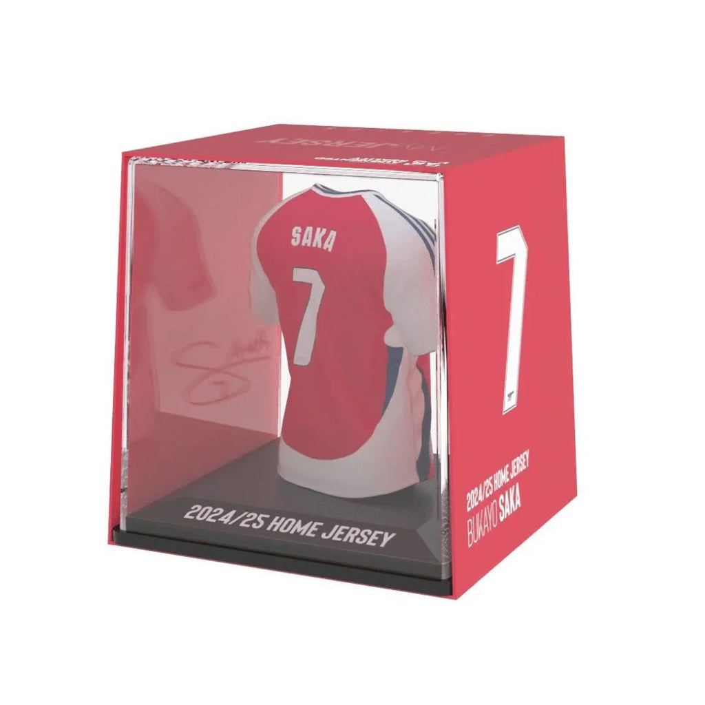 This meticulously designed "MyJersey" figure perfectly embodies Bukayo Saka's dynamic presence, showcasing a stylized representation of his iconic Arsenal home jersey. Crafted with precision and vibrant detail, it proudly displays the classic red and white of Arsenal, complete with the club crest and authentic design elements, signifying the passion of the Emirates Stadium.