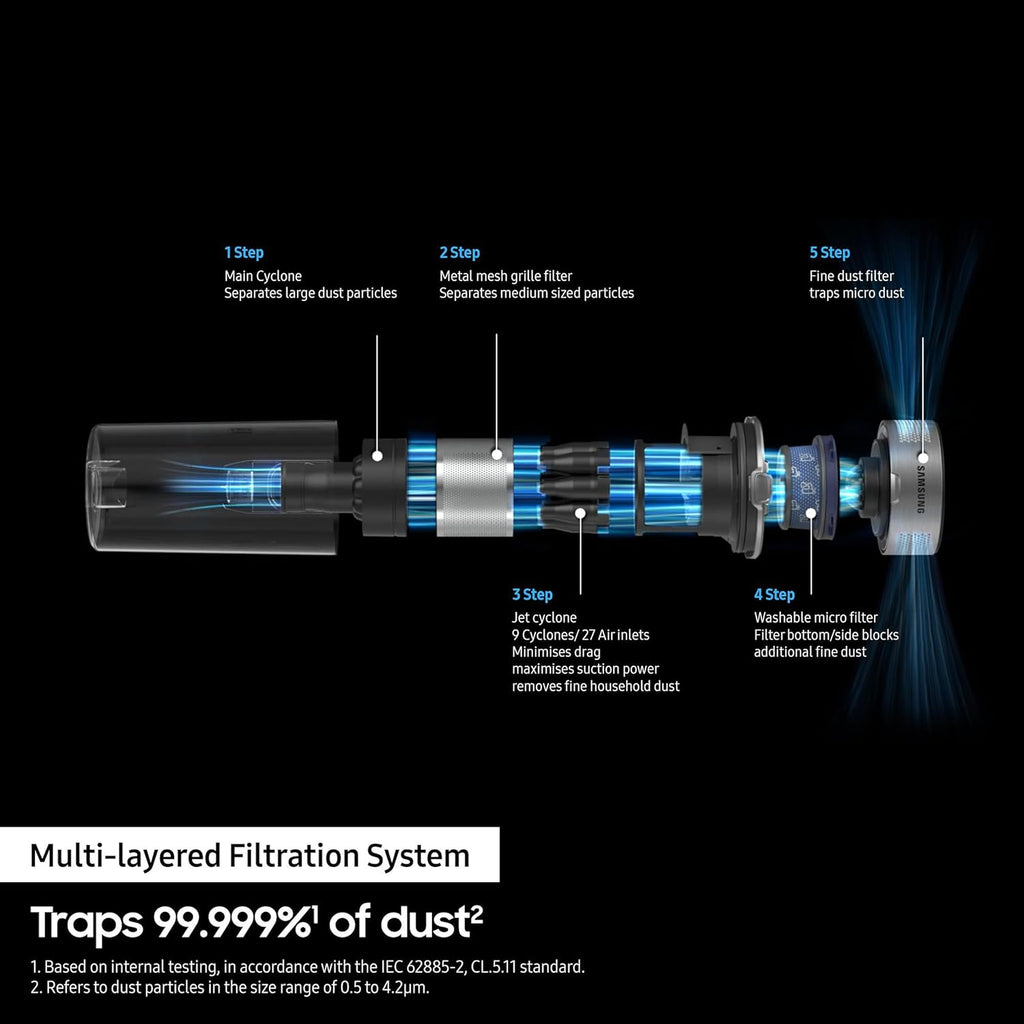 | Other Specs | DIT - Running Time MAX 40m - Charging Time 210m - Li-ion Battery 21.6V - Jet Multi Cyclone - 99.999% Filteration - Washable Dustbin |