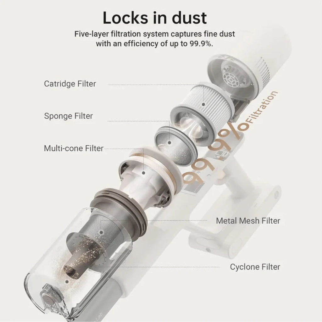 - Effective filtration system: The state-of-the-art, advanced filtration system guarantees an efficiency of 99.9%. Thanks to its five-layer design, the system eliminates even tiny dust particles and collects them in a 0.5 L container that you can easily empty at the touch of a button. The air in your home will be fresh and free from secondary contamination caused by vacuuming! Breathe a full breath and enjoy pristine cleanliness!