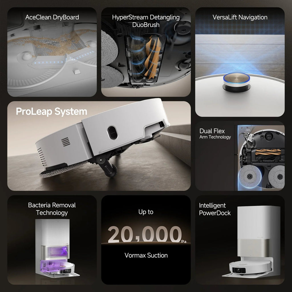 - Obstacle Navigation: Equipped with retractable legs, the X50 Ultra Complete can lift itself over thresholds up to 6 cm high and navigate under furniture as low as 8.9 cm, ensuring thorough coverage across various floor types.